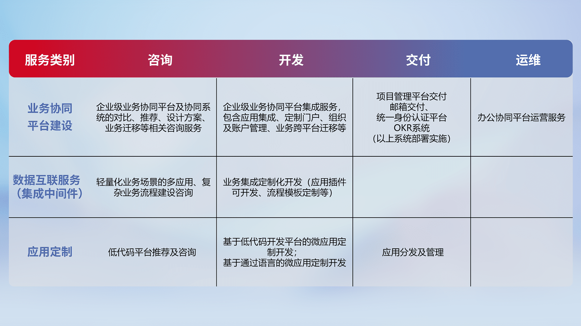 针对特定行业场景的全代码开发服务,,,,精确足满足客户业务服务及系统定制化需求。。重点服务汽车、、农业、、、制造业等高端高质量客户。。。提供如专业管理系统、、、、定制化门户、、、、业务工作台等开发落地。。。。