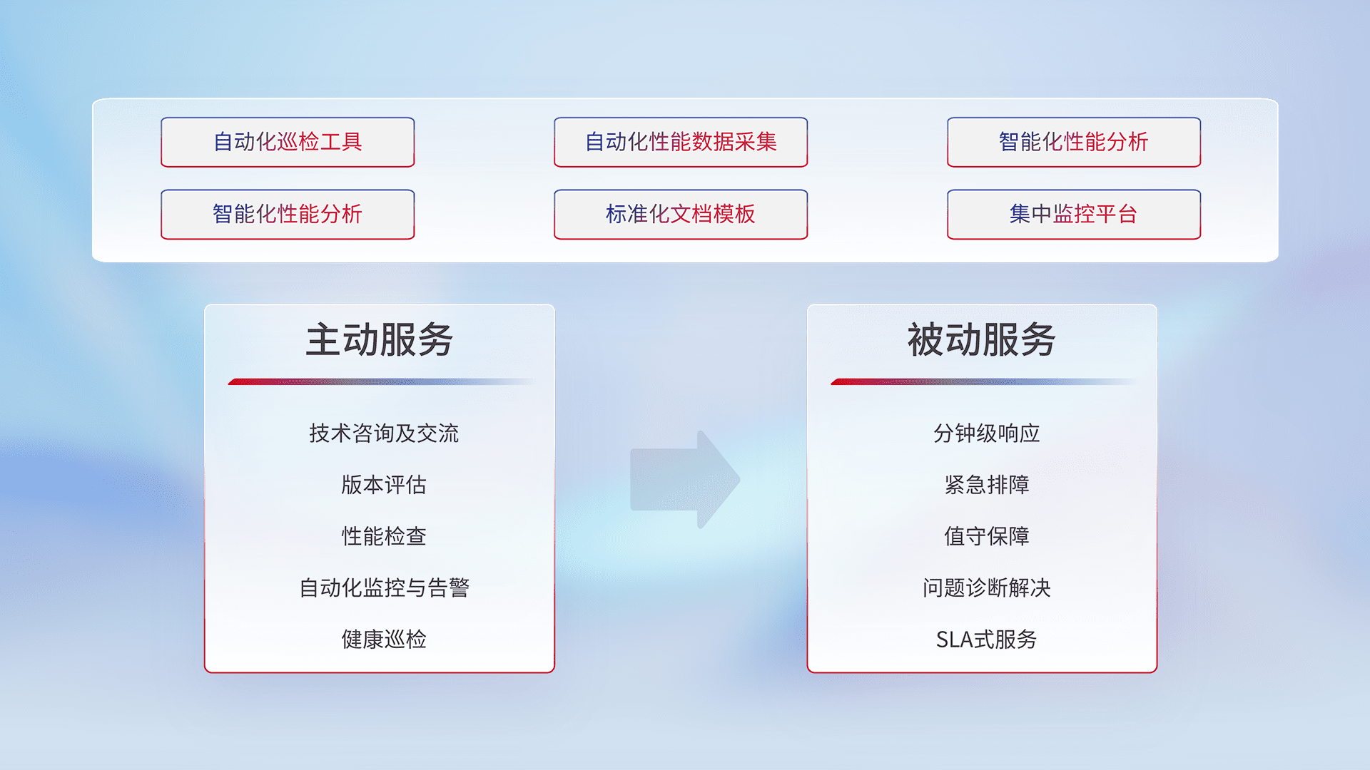 智能化工具和标准化文档,,保障服务质量,,,,提供主动服务(包含技术咨询、、、版本评估、、性能检查、、自动化监控与告警、、健康巡检)和被动服务包含(分钟级响应、、、紧急排障、、、值守保障、、、、问题诊断解决、、、、SLA服务)。。。。